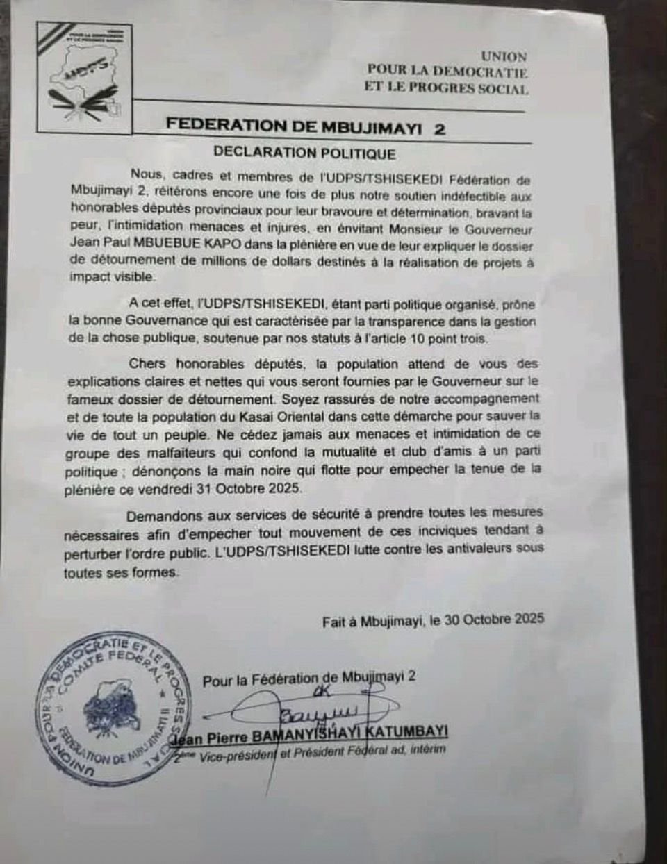 Dans une déclaration politique publiée le jeudi 30 octobre 2025, signée par Jean-Pierre Bamanyishayi Katumbayi, vice-président et président fédéral intérimaire, la Fédération 2 salue la bravoure des élus provinciaux qui, selon elle, ont résisté à « la peur, aux intimidations, aux menaces et aux injures » pour exiger du gouverneur des explications sur la gestion de plusieurs millions de dollars destinés à des projets à impact visible.