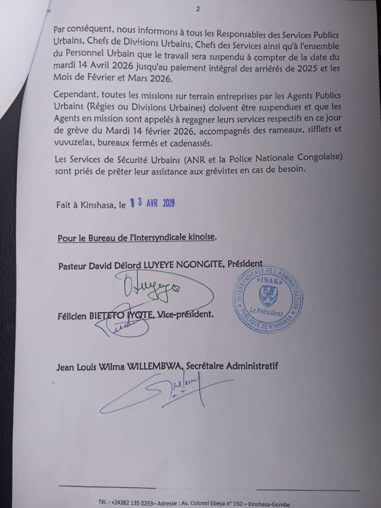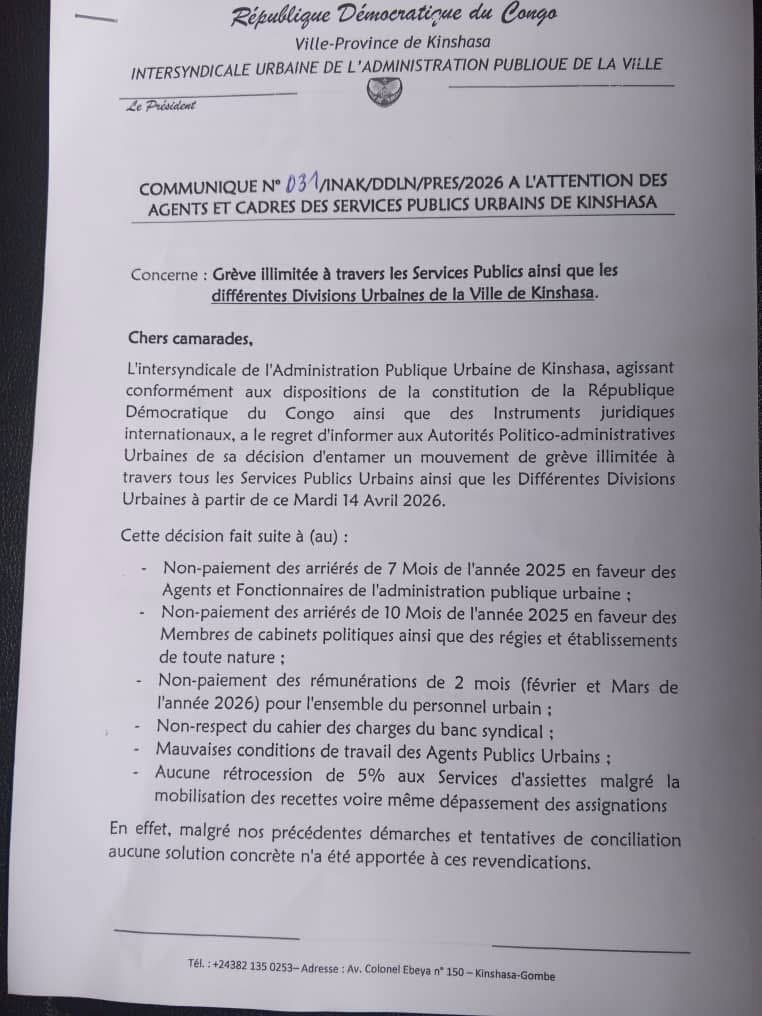 À Kinshasa, l’Intersyndicale de l’Administration publique urbaine a annoncé le déclenchement d’une grève illimitée à partir du mardi 14 avril 2026. Cette décision, rendue publique dans un communiqué officiel daté du 13 avril, concerne l’ensemble des agents et cadres des services publics urbains ainsi que les différentes divisions de la ville.